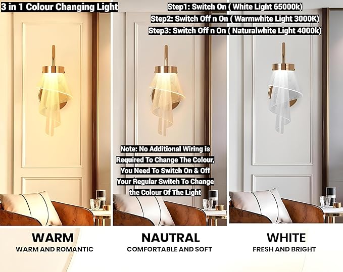 - 3 Step Colour Changing Modes Step 1: Switch On ( White light 6500k) Step 2: Switch Off & On ( Warmwhite light 3000k) Step 3: Switch Off & On ( Naturalwhite light 4000k)
